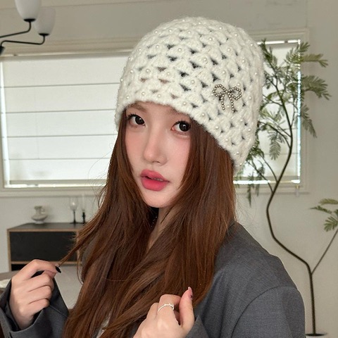 中空帽子ファッションデザイナー女性ビーニー冬秋帽子カジュアルニット帽子パールボウ付き冬帽子