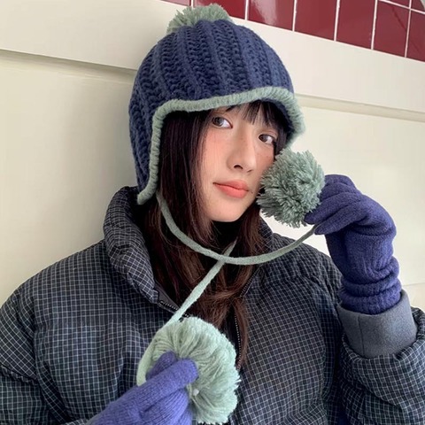 カラーブロックFahionカジュアルハットハンギングボールニットキャッププルオーバー帽子女性かわいい小さな帽子イヤーマフ帽子ビーニー